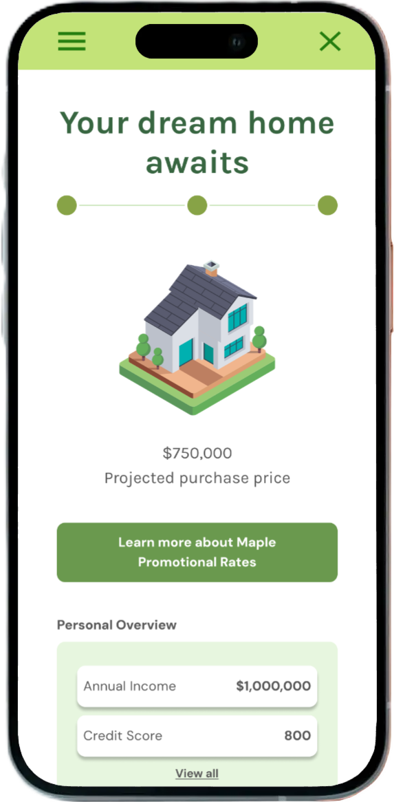Bloom is mobile app for a canadian neo-bank, Maple Bank, and is designed to support first-time homebuyers—especially younger adults—through the mortgage process.