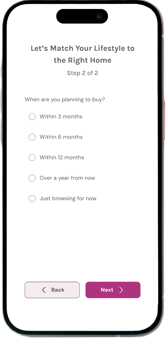 Key frames of the final dream house flow. I designed it to guide users through a personalized journey to match their lifestyle, financial goals, and family needs with the right home options.