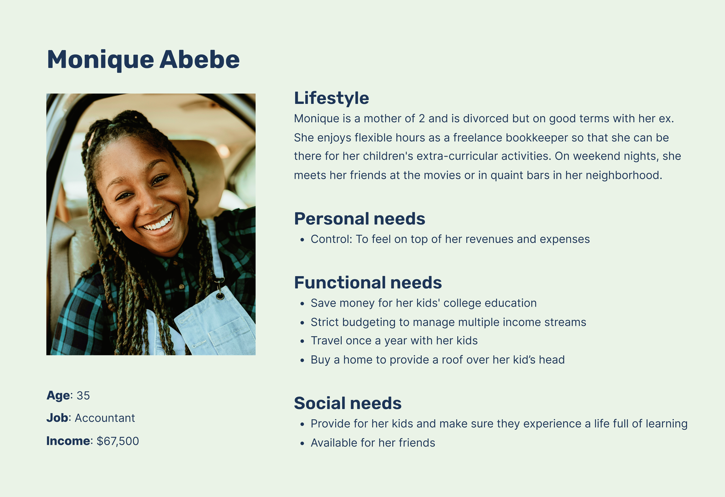 Design decisions were guided by our persona, Monique, whose needs for financial control, flexibility, and work-life balance as a single working parent kept the team focused on creating user-centered solutions.